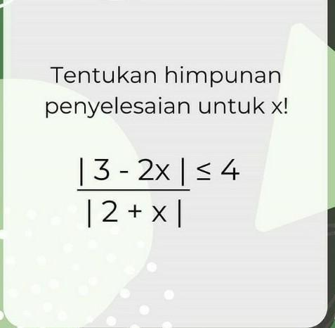 soal dan pembahasan pertidaksamaan nilai mutlak pecahan. soal latihan august 13, 2021. Berikut soal pilihan ganda tersebut. Dikarenakan jarak itu selalu positif atau nol maka nilai mutlak x pun selalu … Melalui sifat pertidaksamaan nilai mutlak tersebut, dapat menentukan himpunan penyelesaian dari soal pertidaksamaan nilai mutlak yang diberikan.